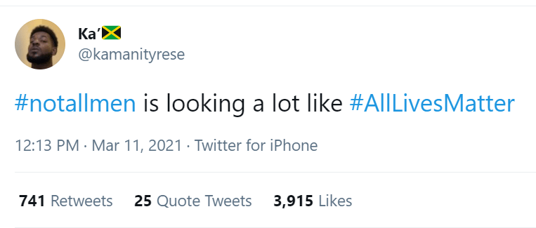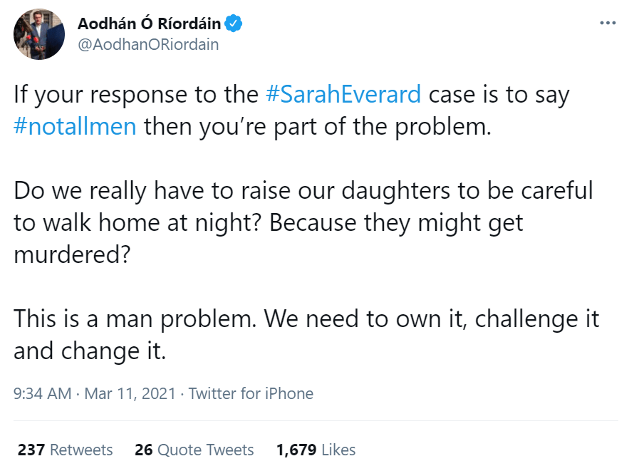 To add to the anger, frustration, and deep sadness women were feeling when this news came to light, the #notallmen hashtag began trending as men took to Twitter to object to being put into the same category as men who abuse women. Many have tweeted back in discontent with the trending hashtag, such as Irish politician Aodhán Ó Ríordáin who says “If your response to the #SarahEverard case is to say #notallmen then you’re part of the problem”. Another Twitter user @kamanityrese compares the #notallmen hashtag to the #AllLivesMatter.